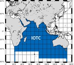 | インド洋(FAO統計海区51及び57)とその付属海のうち、南極前線(南極収斂線)より北で、インド洋に来遊する高度回遊性魚類の保存と管理のために必要と考えられる海域(ただし、西側の境界はFAO統計海区より10度広くとられ、東経20度とし、ICCATの管轄と区分けをしている)。 | ![]() |