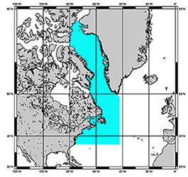 | 以下の定義で定めた北西大西洋海域:北緯35度以北の北西大西洋の水域であって、北緯35度西経42度の点から真北に子午線に沿って北緯59度との交点まで、そこから真西に緯度線に沿って西経44度との交点まで、そこから真北に子午線に沿ってグリーンランドの沿岸までの線の西側の水域、並びにセント・ローレンス湾、デイヴィス海峡及び北緯78度10分以南のバフィン湾の水域。 | ![]() |